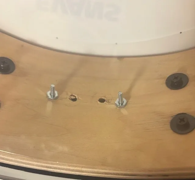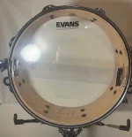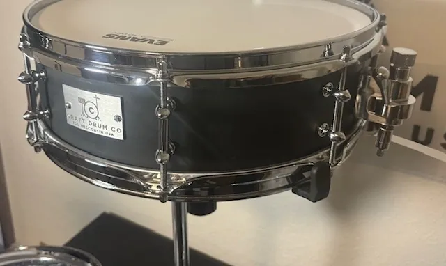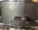 This drum was part of a trade that was in rough condition. It has been cut down from 6″ depth to 4″ to match its natural ‘snap’ and remove the hollow resonance. Bearings all redone. Hand-painted matte black and Super Low Gloss finish. We replaced all parts on the drum. We do not know the maker of the drum as there was nothing on it when we received it, but the shell externally is maple. One of the snare beds is a little wide, but it sounds great!